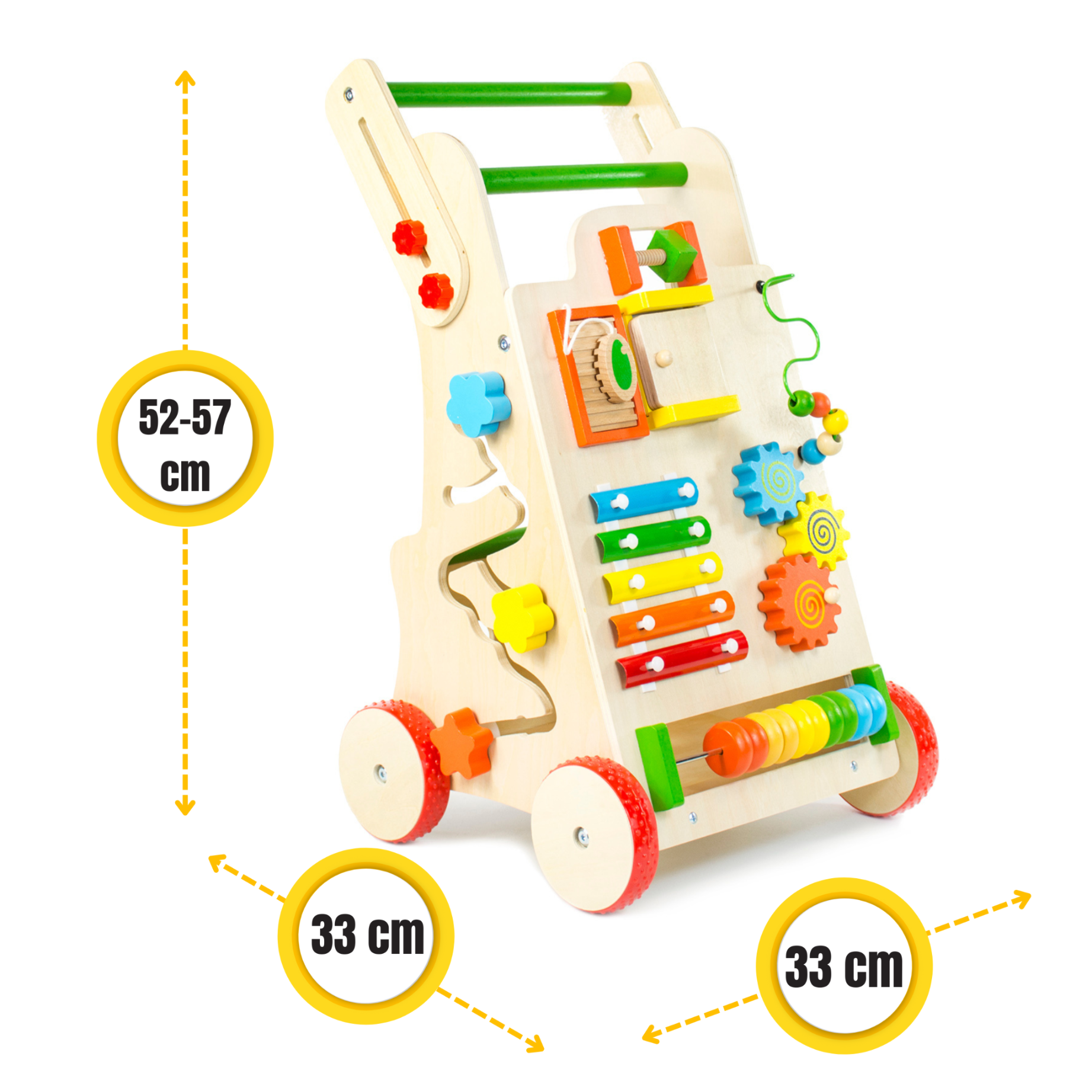 ☑️ Nauka chodzenia jeszcze nigdy nie była tak fascynująca! Ten drewniany pchacz to nie tylko wsparcie dla malucha w stawianiu pierwszych kroków, ale także prawdziwe centrum edukacyjnej zabawy. Każda ze ścian kryje inne atrakcje, które angażują dziecko i rozwijają jego zdolności manualne. Ruchome elementy, dźwięki, kolory – wszystko po to, by maluch czuł się jak odkrywca! Do tego antypoślizgowe koła, bezpiecznie zaokrąglone rogi i regulowana rączka sprawiają, że towarzyszy dziecku na każdym etapie nauki chodzenia. A na koniec? Schowek na ulubione zabawki, bo wiadomo – skarby trzeba mieć zawsze przy sobie! ♥️