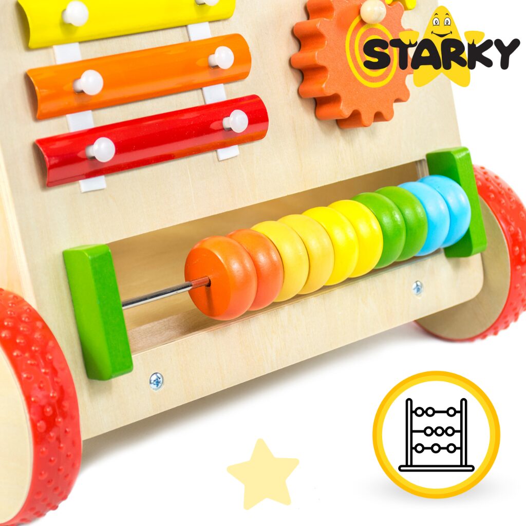 ✔️ Pchacz ma cymbałki, liczydło, sorter, labirynt, trybiki, lusterko i ruchome kulki, które wspierają rozwój dziecka i sprawiają, że zabawa nigdy się nie nudzi!