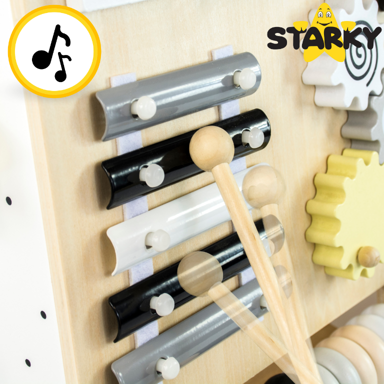 ✅ Różnorodne atrakcje – cymbałki, labirynt, sorter, lusterko i inne interaktywne elementy.