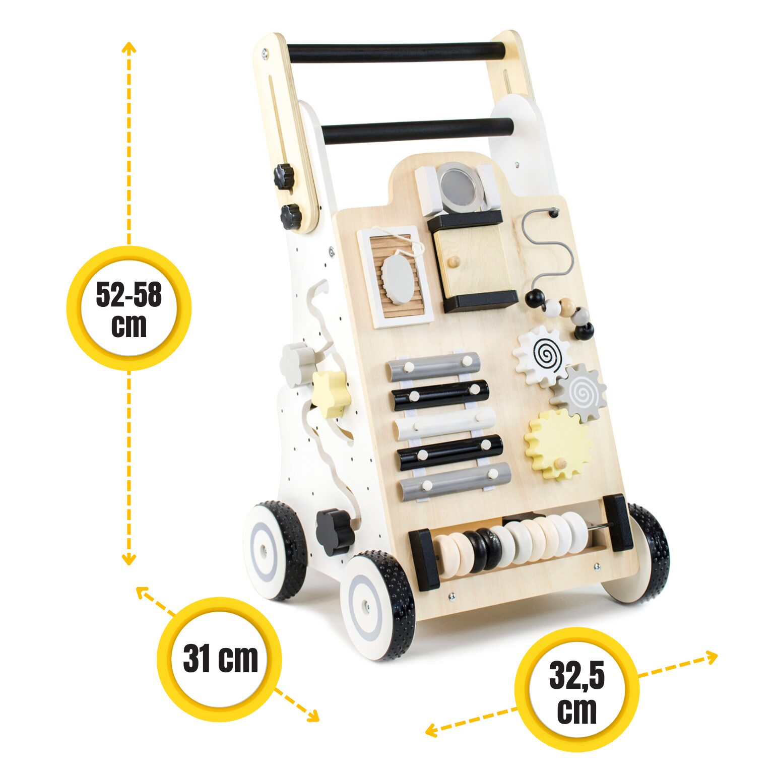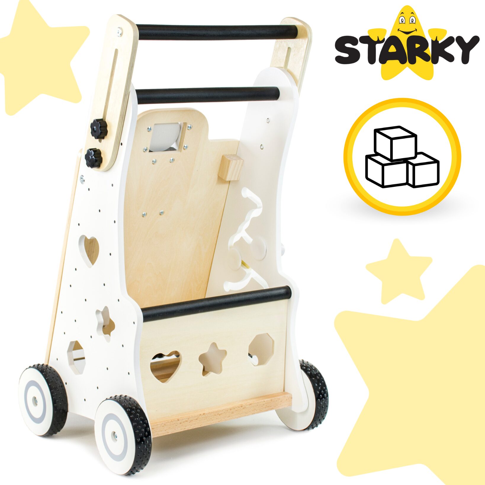 ☑️ Nauka chodzenia jeszcze nigdy nie była tak fascynująca! Ten drewniany pchacz to nie tylko wsparcie dla malucha w stawianiu pierwszych kroków, ale także prawdziwe centrum edukacyjnej zabawy. Każda ze ścian kryje inne atrakcje, które angażują dziecko i rozwijają jego zdolności manualne. Ruchome elementy, dźwięki, kolory – wszystko po to, by maluch czuł się jak odkrywca! Do tego antypoślizgowe koła, bezpiecznie zaokrąglone rogi i regulowana rączka sprawiają, że towarzyszy dziecku na każdym etapie nauki chodzenia. A na koniec? Schowek na ulubione zabawki, bo wiadomo – skarby trzeba mieć zawsze przy sobie! ♥️