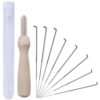 Nie musisz martwić się o brak podstawowych narzędzi. Nasz zestaw zawiera wszystko, co potrzebne, aby zacząć zabawę: od igieł po matę piankową, nożyczki i drewniany uchwyt.