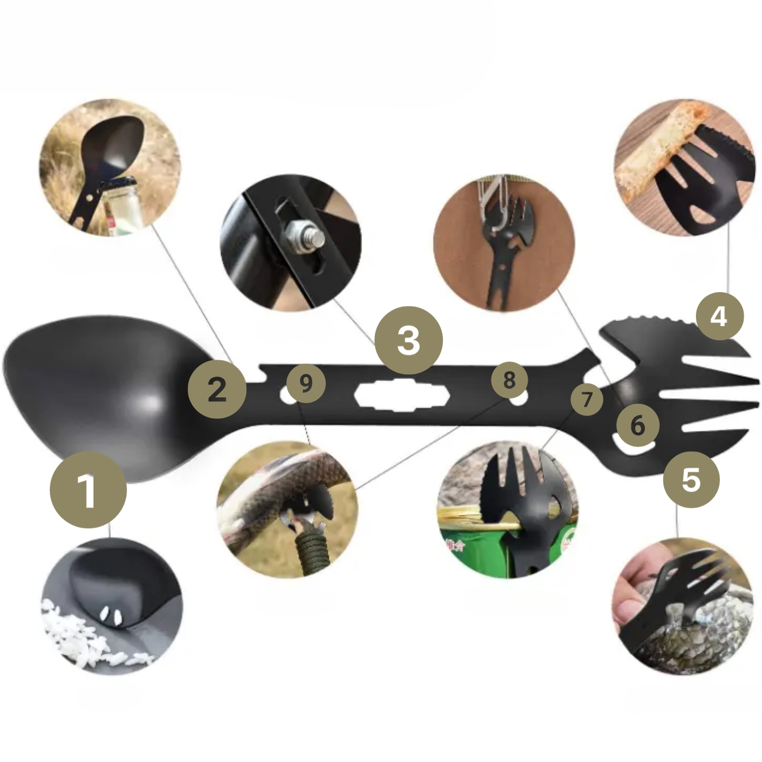 Wielofunkcyjne narzędzie, które przyda się podczas spożywania polowych posiłków. Wykonane z wytrzymałego metalu o właściwościach antykoryzyjnych.