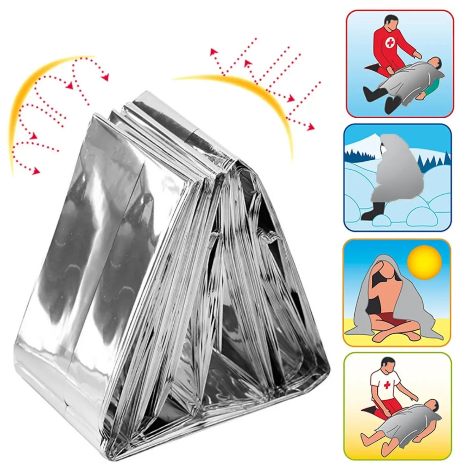 Zabezpiecza przed wyziębieniem i umożliwia ogrzanie ciała podczas trudnych warunków pogodowych. Koc chroni również przed przegrzaniem – jego srebrna strona odbija promienie słoneczne.